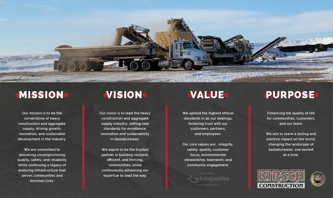 Welcome to Kirsch Construction (2008) Ltd. We specialize in crushing, hauling and delivery of gravel/aggregates throughout our great province of Saskatchewan. With our headquarters located in Humboldt, SK. Our products and services are trusted by the Govemment, Municipalities, Contractors, as well as our Rural and Urban Customer base. Additionally, we provide earthworks services for all types of infrastructures, including but not limited to site preparation, hauling, erosion control, marina construction, deep patching and more.